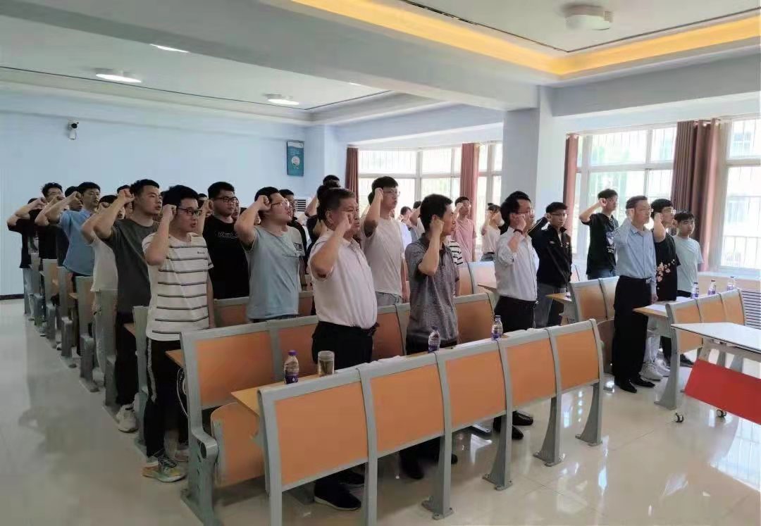 本次主题党日活动形式多样、内容丰富,分为奏唱国歌、重温入党誓词、党课学习、谈心得体会、佩戴党徽等环节。伴随着雄壮豪迈的音乐,全体师生党员饱含深情的同唱国歌。铿锵有力的宣誓声,充分表达了全体毕业生党员坚定的政治信念和矢志奋斗的决心。