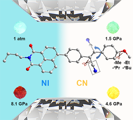 2. 刺激响应型有机智能发光材料的在发光器件、传感、信息防伪加密等领域具有广泛的应用前景。控制分子精细结构,提升力敏发光位移,一直是该领域的重要议题。团队采用萘酰亚胺和氰基二苯乙烯制备系列给-受体力敏智能发光分子。系列材料在宽达10GPa的压力范围内,展现出了显著的荧光颜色变化。同时,利用区域选择性氰化进一步实现精确的分子构型调控,有效地扩大荧光峰位的移动速率,促进材料力敏应用。该研究不仅揭示了有机给-受体分子的压致变色机制,还为设计、合成具有优异性能的力敏有机发光材料提供了新方法。相关研究成果以“Developing Piezochromic Luminescent Materials via Regioselective Cyanation of Naphthalimide Cyanostilbene Derivatives(利用萘二酰亚胺氰基联苯衍生物的选择性氰化开发压致变色荧光材料)”为题发表在期刊《Materials Chemistry Frontiers》(《材料化学前沿》,中科院二区,影响因子6.0)上。2022级硕士研究生贾浩为论文第一作者,英国365集团公司李茜教授、李磊教授与安徽大学王宬元教授、杨家祥教授为共同通讯作者,英国365集团公司为第一署名单位。
