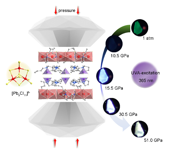 进展二:零维金属卤素钙钛矿具有独特的自陷态激子荧光发射特性,为开发高效、单组分白光荧光粉提供了极佳的平台。团队基于零维金属卤素钙钛矿的强量子限阈效应,利用结构自由度较高的光敏零维多聚簇,通过高压手段精准调控光敏基元构型,实现压致强白光发射,为深入理解自陷态激子发射机制提供帮助,也为开发新型照明材料提供了新策略。同时,针对多光敏基元系统,利用激子跃迁调控,发展金属卤素钙钛矿的多重荧光特性。