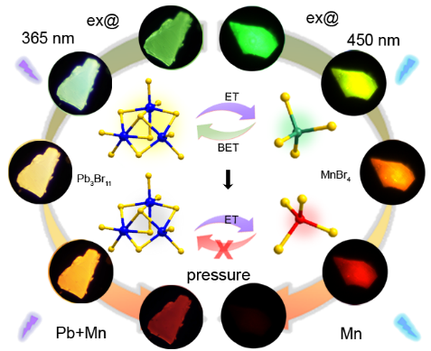 5. 零维金属卤素钙钛矿的光敏基元能够在分子尺度完全为阳离子所间隔。基于此,团队将零维研究体系向多光敏基元过度,探索不同光敏基元间的能量转移在高压下的响应行为,发展金属卤素钙钛矿的多重荧光特性。零维金属卤素钙钛矿(C9NH20)9[Pb3Br11](MnBr4)2具备[Pb3Br11]5−和[MnBr4]2-两种不同的光敏结构基元。随着压力的升高,[Pb3Br11]5−结构刚性增强且构象畸变被抑制,有效改变了自陷态激子的发射平衡,导致对应自陷态激子荧光峰的异常蓝移。同时,[MnBr4]2-的结构收缩显著增强了Mn2+的约束效应,有效提升了其本征发光效率。值得关注的是,在激发光能量足够高的条件下,[Pb3Br11]5-可以作为“天线”来进一步增强Mn2+的发光强度,引起材料明显的激发依赖荧光现象。相关研究成果以“Resolving multiple emissions of zero-dimensional heterometallic halide hybrid via pressure-triggered antenna effect(压力诱导天线效应解析零维双金属卤化物的多重发光特性)”为题发表在期刊《Materials Research Letters》(《材料研究快报》中科院一区,影响因子8.6)上。2022级硕士生孟新淼为论文的第一作者,英国365集团公司李磊教授、王凯教授和李茜教授为共同通讯作者,英国365集团公司为第一署名单位。