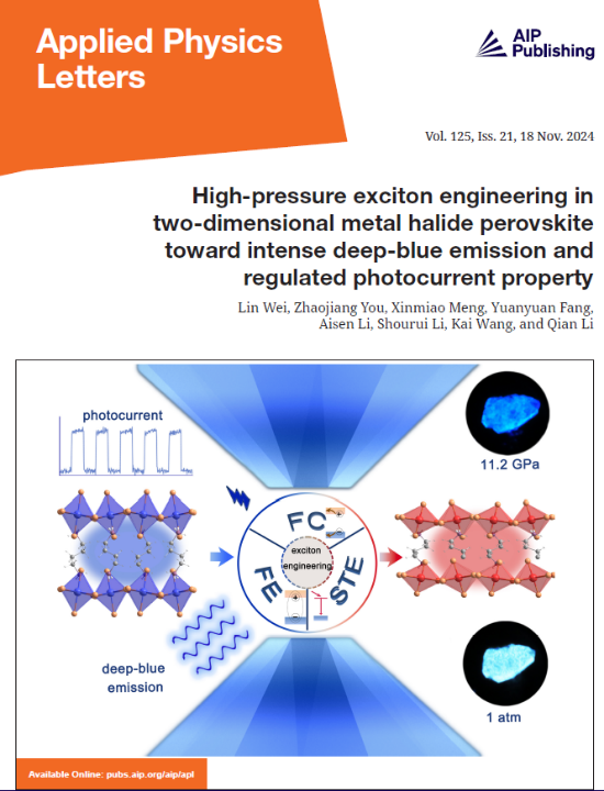 6. 二维金属卤素钙钛矿中兼具高维与低维金属卤素钙钛矿的不同结构特性。针对二维金属卤素钙钛矿10% Pb²⁺掺杂BDACdBr₄(BDA:1,4-丁二胺)体系,团队通过高压手段调控激子行为,有效优化材料的光致发光和光电流特性。高压下,相互作用较弱的层间结构被显著收缩,电-声耦合作用降低且激子结合能减小,限制激子的系间窜跃,更多光生激子以自由激子形式返回基态。材料自陷态激子发光逐渐减弱,且自由激子发光逐渐增强。随着压力继续升高,常压结构转为高压相,激子结合能的进一步降低使得激子一方面以自由激子形式辐射跃迁,引起强烈深蓝光发射。同时,光生激子还会发生解离,促进自由电荷迁移引起光电流效应的增强。相关研究成果以“High-pressure exciton engineering in two-dimensional metal halide perovskite toward intense deep-blue emission and regulated photocurrent property(二维金属卤素钙钛矿的高压激子调控:强深蓝光发射与光电流性能调制)”为题发表在期刊《Applied Physics Letters》(《应用物理快报》,中科院二区,影响因子3.5)上,并被选为封面文章。2023级硕士研究生魏林为论文第一作者,英国365集团公司王凯教授、李茜教授和中国工程物理研究院流体物理研究所李守瑞副研究员为共同通讯作者,英国365集团公司为第一署名单位。