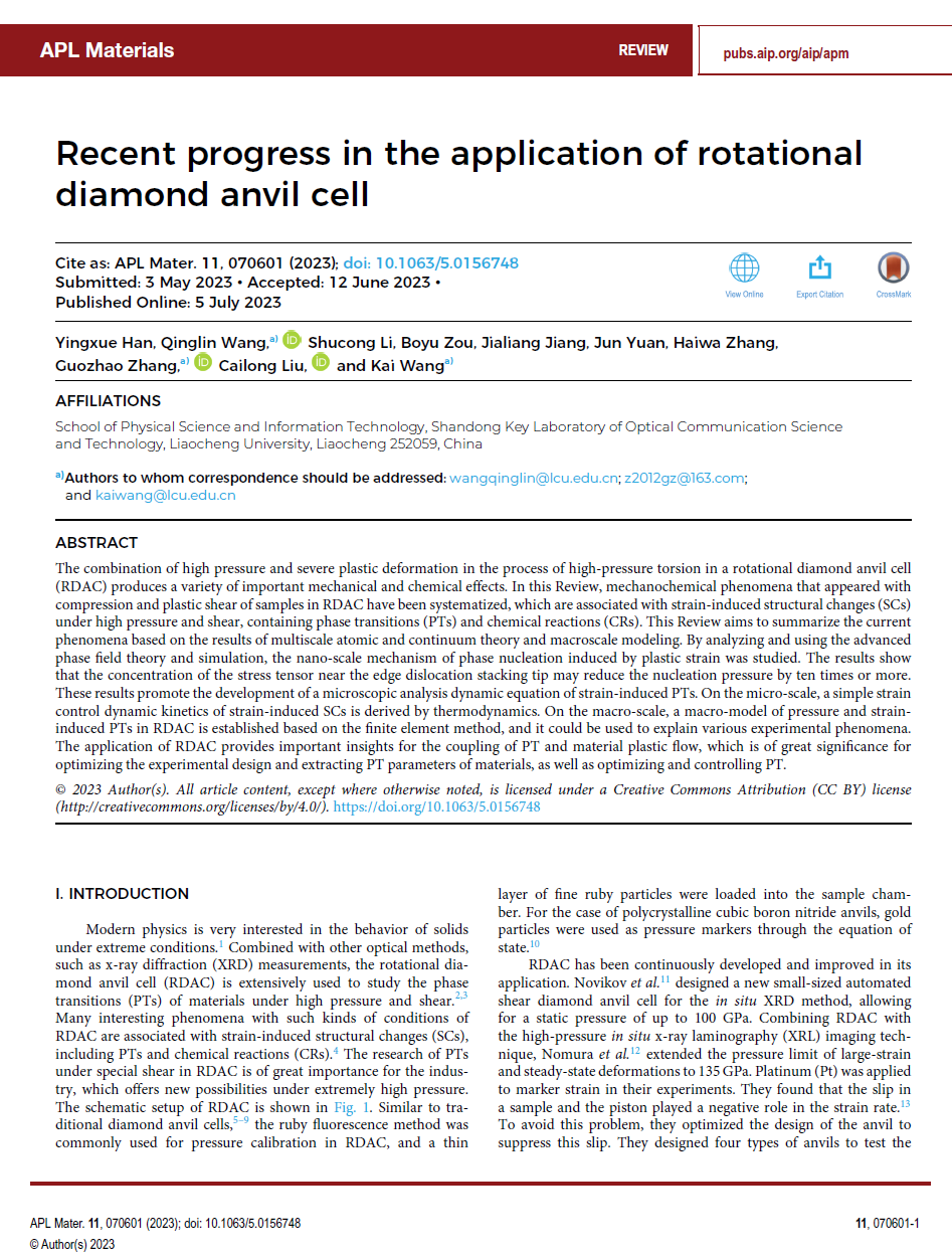 近日,英国上市公司365泰山学者青年专家王凯教授团队指导本科生在《APL Materials》(中科院二区,影响因子6.1)上发表了题为“Recent progress in the application of rotational diamond anvil cell(旋转金刚石对顶砧技术的最新应用进展)”的综述文章。2020级物理学专业本科生韩莹雪为文章第一作者,王庆林副教授、张国召博士、王凯教授为共同通讯作者,刘才龙教授、张海娃博士,研究生邹博宇、姜家梁,本科生李树聪、袁骏共同参与了该工作,英国365集团公司为唯一署名单位。