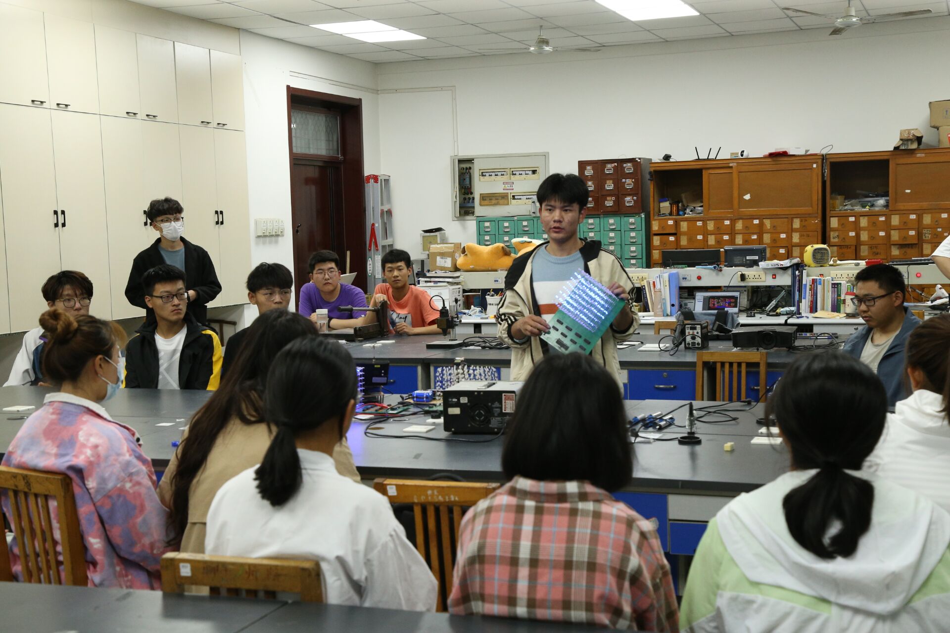 讲解人向同学们展示了精致奇特的光立方、设计精美的蓝牙智能车,美观实用的数码管时钟以及炫彩夺目的摇摇棒时钟等诸多科技作品,让大家赞叹不已。他们从程序设计,作品性能与材料准备等多个方面进行介绍,或激情昂扬,或幽默风趣,或娓娓道来地分享制作过程。他们以缜密的思维与清晰的语言对同学的问题做出合理的解答,同学们听得聚精会神,不时认真地做着笔记,提高了同学们学习的积极性。培训会在阵阵掌声中落下帷幕,他们表示:“学院一直在物质上为我们提供帮助,在精神上给予我们关怀,让我们鼓起生活的勇气,全身心投入到学习中,我们一定好好学习知识,做有理想有担当的时代好青年。”