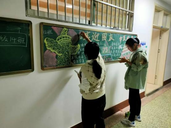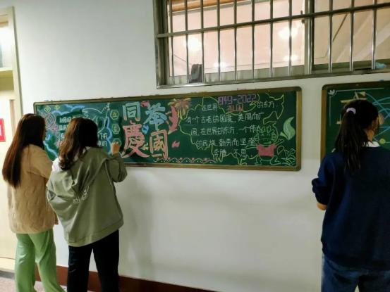 同学们利用课余时间,用粉笔勾勒出一幅幅色彩斑斓的图画,向祖国母亲献礼。同学们创作出的板报异彩纷呈,各具特色:寥寥数笔,描绘出巍巍长城;细致笔触,勾勒出祖国版图;妙笔生花,展现出盛世华夏。