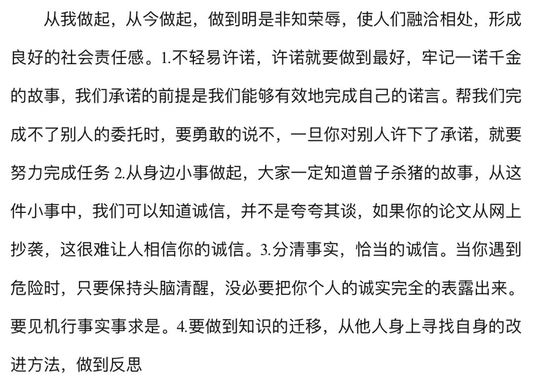 诚信是做人的一种品质,是职业道德的根本,是个人成就事业的根基。活动中,调研人员通过采取数据采集、调查问卷、面谈等各种形式调查大学生的诚信度,深度了解诚信的本质。在调研过程中同学们积极配合、认真回答,有助于参加者更好的进行总结和分析,面谈中,调研人员鼓励同学们从身边的每一件小事做起,培养良好道德品质。参加者根据调查到的结果,认真分析调研数据、总结大学生诚实守信程度,书写800字的调研报告。