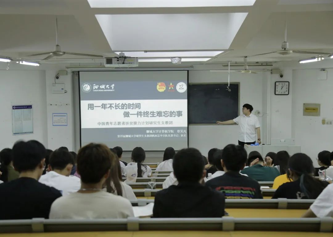在研究生支教团的经验分享中,蔡笑凡详细阐述了研究生支教团的要求与具体流程,对什么是研支团、推荐基本条件、时间安排、政策保障以及研支团服务地等方面进行分享,使同学们对于整个支教过程有了更为系统与清晰的认知。蔡笑凡提到:“青春有很多样子,很庆幸,我的青春有在西部支教的样子”,他鼓励同学们积极争取支教的机会,共同铸就西部计划的“聊大现象”。