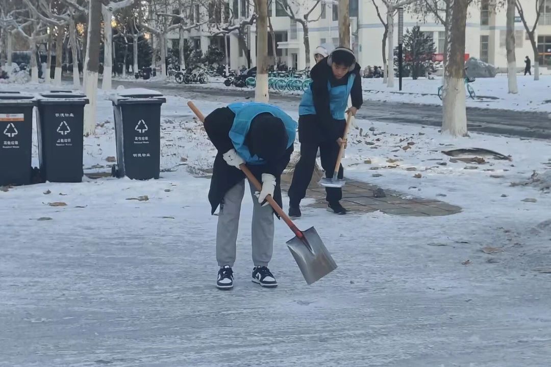 在活动开始前,志愿者们进行了周密而合理的分工,确保每个环节都能有序进行。活动开始后,志愿者们带着铁锹和扫帚来到分配好的场地,开始了紧张而有序的清扫工作。他们以饱满的热情和昂扬的精神风貌投入到清雪行动中,寒冷的天气和厚厚的积雪也无法阻挡他们的步伐。经过一个多小时的辛勤劳动,志愿者们成功地将学院门口和周边道路打扫得干干净净,同时将实验楼前道路也清扫出了一条可供师生行走的小路,这不仅消除了道路安全隐患,还为校园增添了一份整洁和美丽。