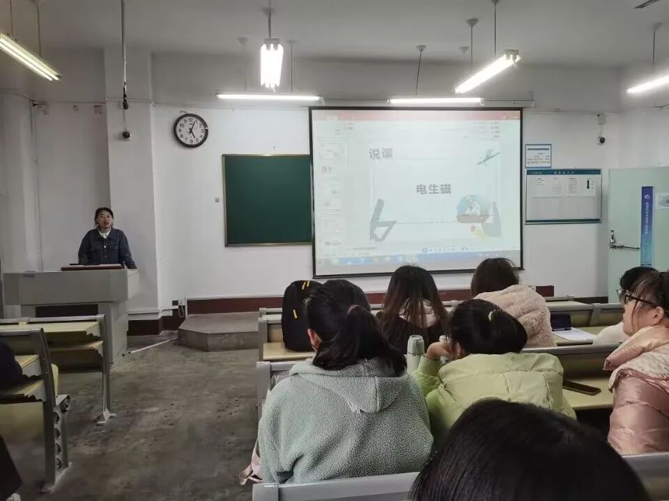 活动伊始,李玉进行了十五分钟的课题试讲,这节课选自人教版初中物理九年级全一册第十四章第二节。授课结束后,李玉介绍了山东省师范类高校学生从业技能大赛的相关要求以及比赛流程,并为同学们讲解了山东省大学生物理教学技能大赛与 “田家炳杯”全国师范院校师范生教学技能竞赛的要求与注意事项,还鼓励同学们以积极的态度参加比赛,提高自己的表达交流能力和思维逻辑能力。