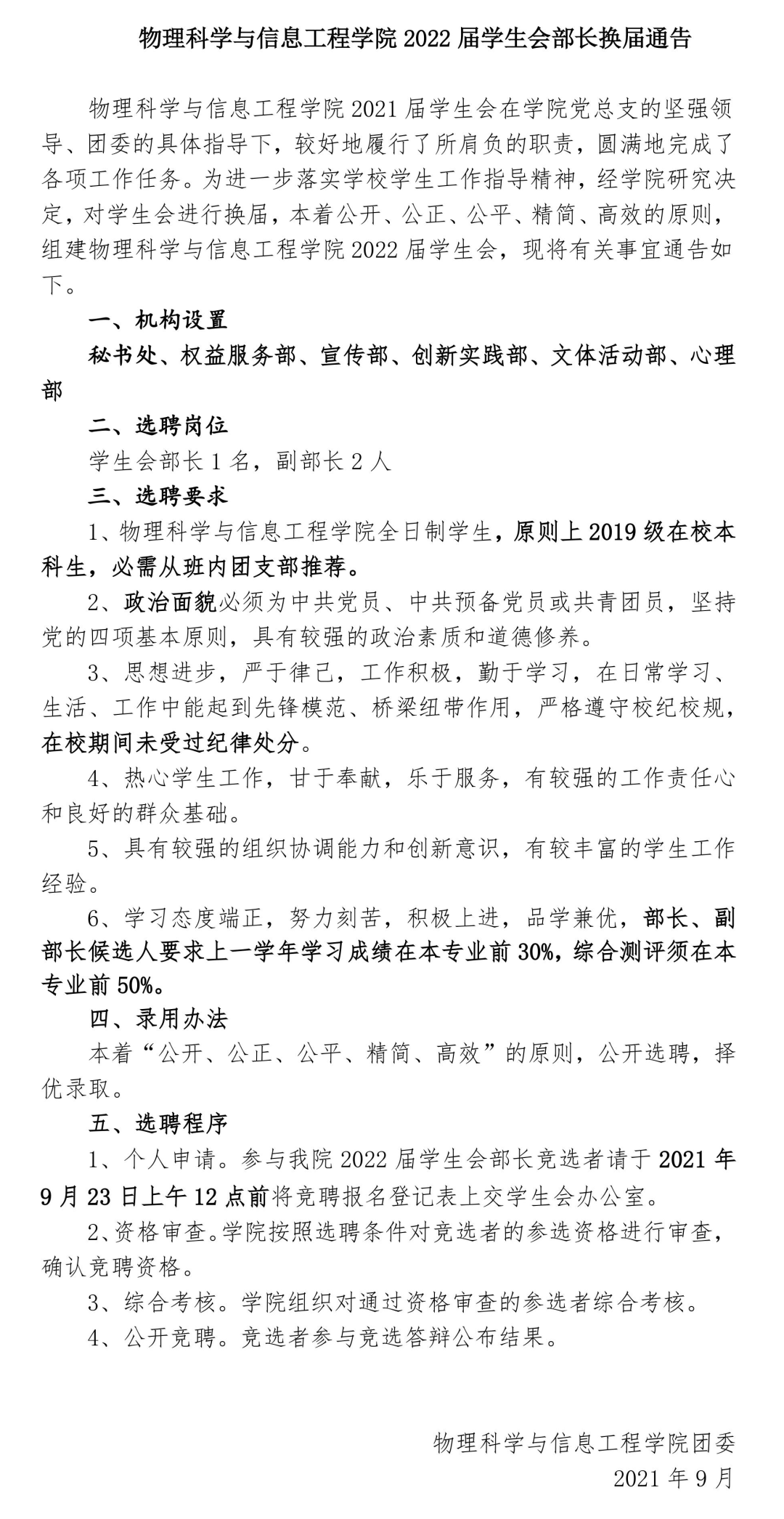 为落实共青团中央、教育部、全国学联联合下发的《关于推动高校学生会(研究生会)深化改革的若干意见》,英国365集团公司下发的《英国365集团公司学生会组织深化改革实施方案》,接受广大师生监督,现将我院截至2021年11月学生会改革情况公开如下。
