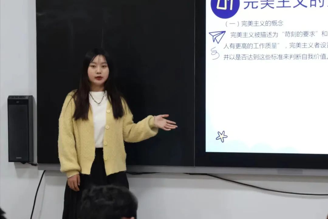 活动伊始,曹欣欣通过小游戏的形式对同学们的心理状况进行简单了解。之后她以“完美主义是什么”这一问题为切入点,从完美主义的表现、完美主义产生的原因、完美主义带来的影响与如何破除完美主义几方面深入阐述。接着,她播放了如何辨别完美主义的视频并展开讲解,指出了产生完美主义的主要原因是建立了消极的思维模式,采用二元对立与灾难性思维模式思考问题,进而达到一种病态心理。这种心理会让人长时间陷入自我焦虑的困境之中,固步自封,以致于错失许多重要机会。她强调,如果发现了这种心理,一定要积极地去面对,将它视为一个自我了解的机会,保持心情的愉悦,勇于接纳不完美的我们。最后,曹欣欣向同学们介绍可以通过顺应、接纳与行动等几个步骤来破除完美主义,通过改变行为模式养成新的习惯,更好地悦纳自己。