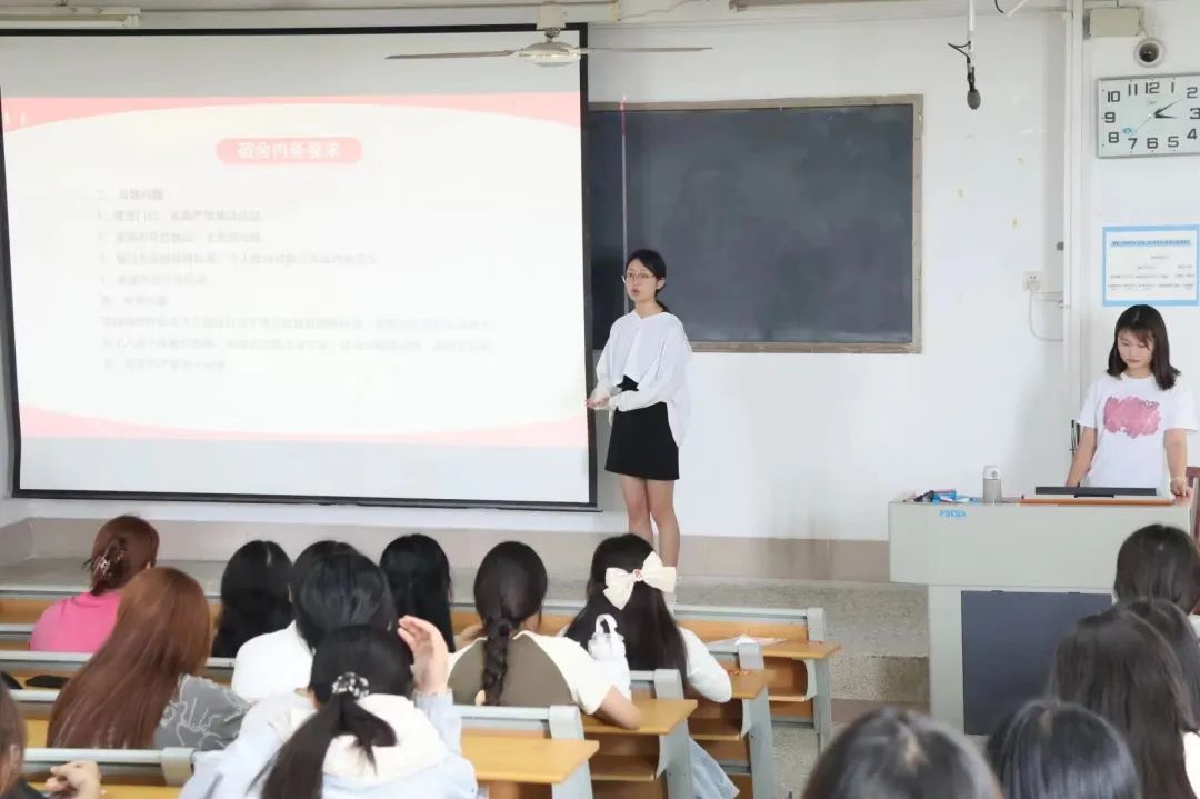 宿舍是温暖的港湾,是心灵的庇护所。宿管部负责人针对近期出现的宿舍问题展开演讲,首先向同学们强调了宿舍舍长的重要作用,希望各位舍长能认识到自己的职责并做好表率,并且对宿舍用电安全、宿舍内务和夜不归宿三大问题展开讨论,表示一定要人走灯灭,禁止使用违规用电器,禁止私自乱接线。同时,他们强调了宿舍内务具体要求,希望各宿舍努力做到内务达标,最后,就夜不归宿问题提出了两点注意,为同学们的住宿安全做了充分保障。