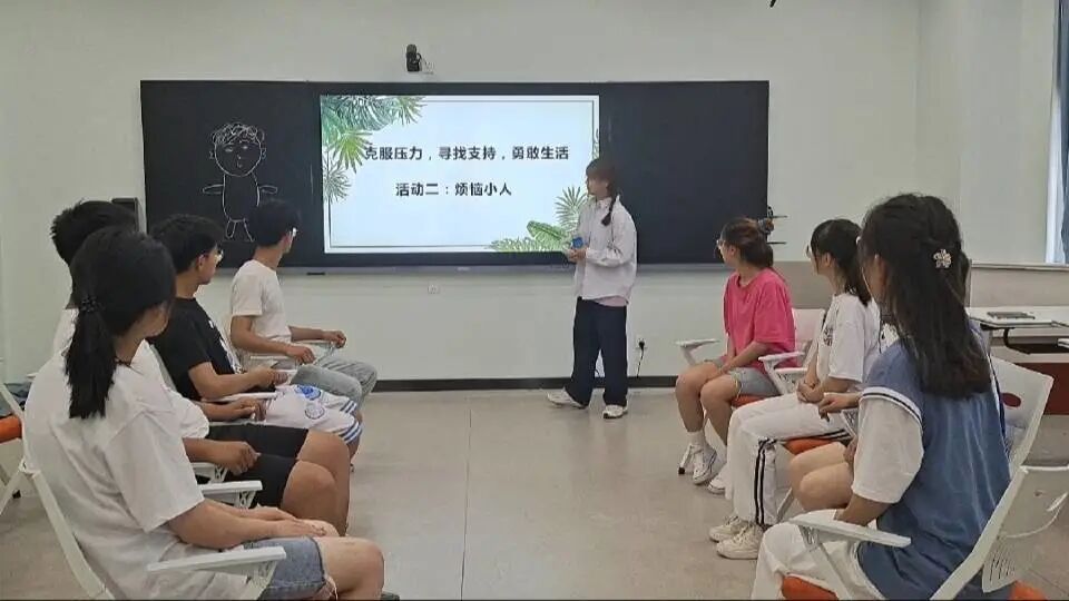 针对学生学习压力大的问题,李雯指导同学们通过“烦恼的小人”游戏认识压力的来源,用心情写字板抒发、宣泄压力,同学们在第三阶段里学会了合理释放压力的方法。在最后的总结阶段里,同学们用肌肉放松的方法感受肌肉群的紧张与放松,对压力引起的生理反应有更深的认识。