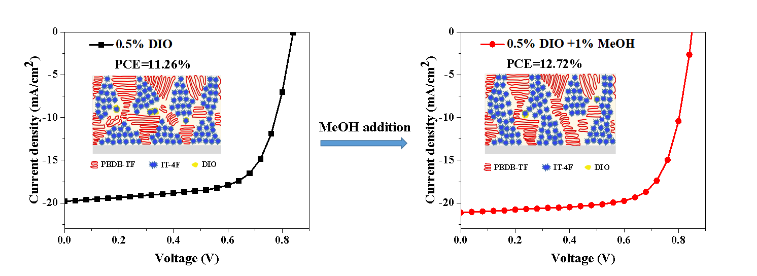 图1 基于0.5%DIO和0.5%DIO+1%MeOH的电池器件的J-V特性曲线以及活性层形貌示意图
