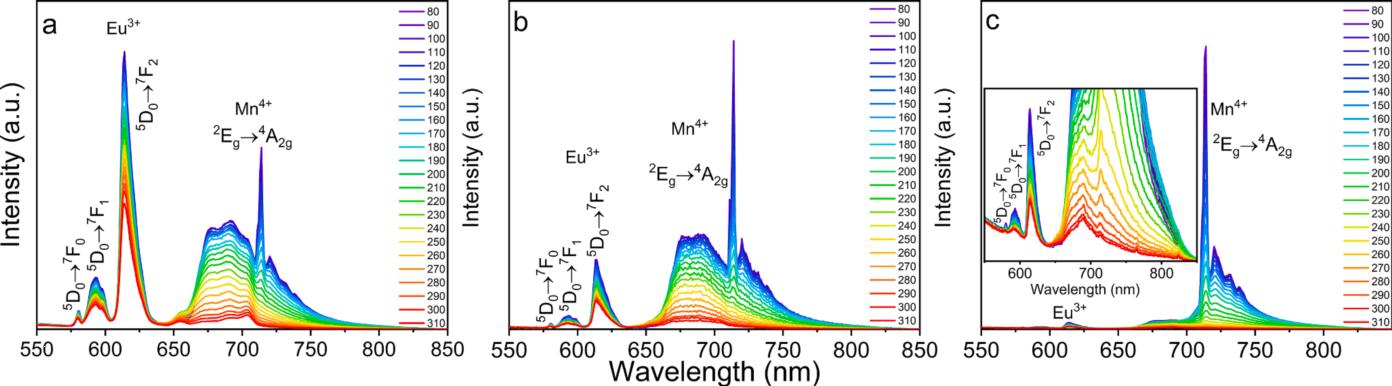 由于具有响应速度快、测量精度高、可远距离非接触测量等优点,基于荧光强度比的荧光测温法受到人们广泛关注。在高发光效率的前提下,如何提高荧光温度计的灵敏度成为人们研究的重点。针对该问题,课题组研究人员提出了电荷补偿和双相共生长协同作用提高荧光温度计性能的方法,利用该方法可有效提高了晶体的发光效率和温度灵敏度。第一项工作(《Influence of charge compensation on the photoluminescence and temperature sensing of zinc titanate composites》)中,研究人员分别在ZnO-TiO2混合相、ZnTiO3钛铁矿-钙钛矿混合相以及TiO2-Zn2TiO4混合相中掺杂了Li+,通过Li+补偿Eu3+与Ti4+和Zn2+的电荷差,提高了晶体的发光效率,并利用混合相中晶体场的差异,提高了晶体的温度灵敏度,解决了电荷平衡中高发光效率低灵敏度的问题。第二项工作(《Dual-mode optical thermometer based on fluorescence intensity ratio of Eu3+/Mn4+ co-doping zinc titanate phosphors》)中,研究人员在第一项工作的基础之上,制备了具有钛铁矿和钙钛矿同质异构的ZnTiO3纳米晶体,利用Mn4+在钛铁矿和钙钛矿晶格中的能级跃迁差异,实现了3.2 %/K的高相对灵敏度和0.01K的温度分辨率。上述成果对新型高灵敏度荧光温度计的设计具有一定的指导意义。