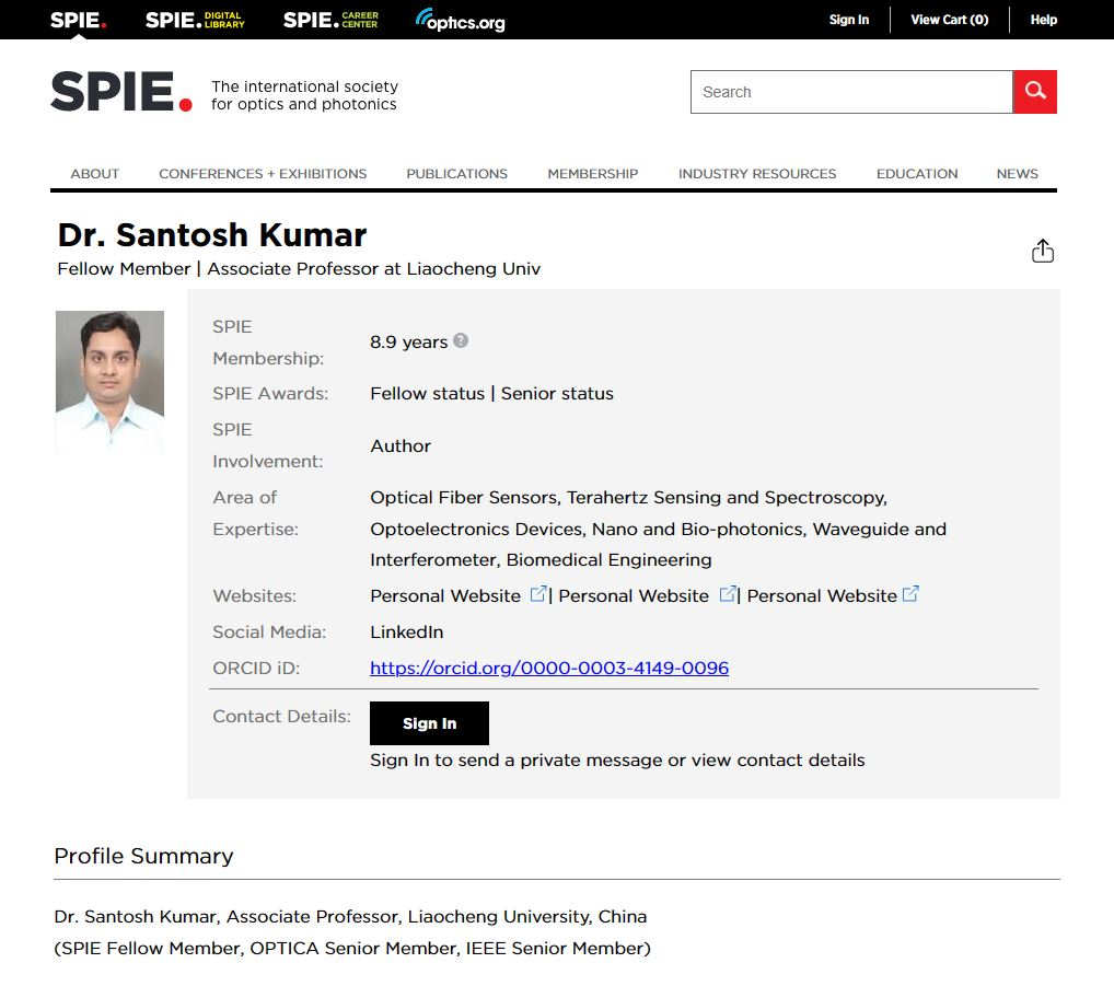 近日,国际光学工程学会(Society of Photo-Optical Instrumentation Engineers,SPIE)公布了2023年新入选的83位会士名单,其中共有8位来自中国高校及科研机构的科学家当选,365英国上市(CHN·集团有限公司)官方网站-Official website 版权所有Santosh Kumar 副教授由于其在光纤等离子体生物传感器临床应用方面的开创性贡献成功入选SPIE Fellow(国际光学工程学会会士)。