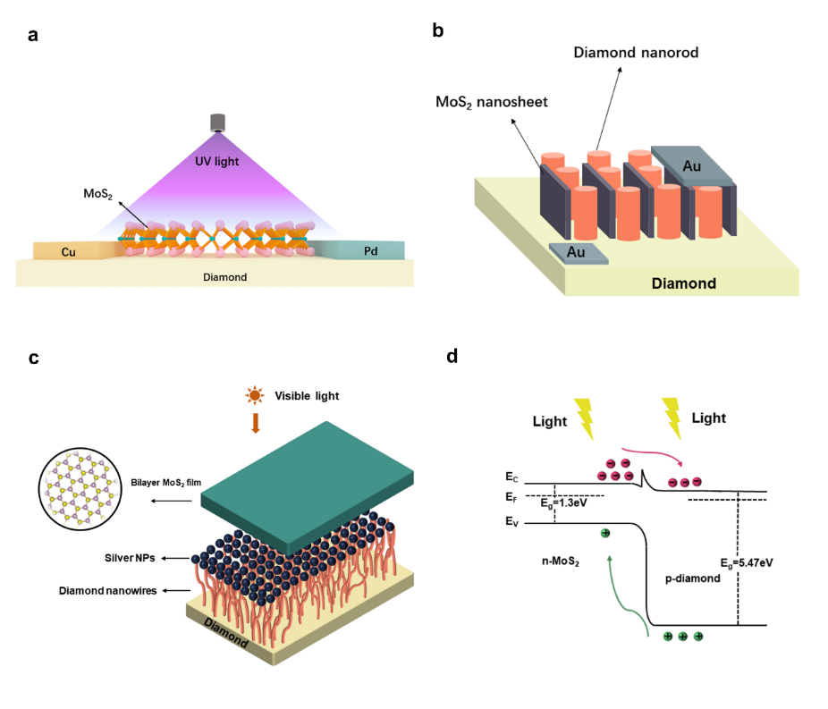 图1. (a)具有不对称电极的MoS2/金刚石异质结光电探测器的结构图; (b) 垂直MoS2纳米片/金刚石纳米棒光电探测器; (c) 双层MoS2薄膜/银纳米粒子/金刚石纳米线/金刚石光电探测器; (d) MoS2/金刚石异质结能带结构示意图