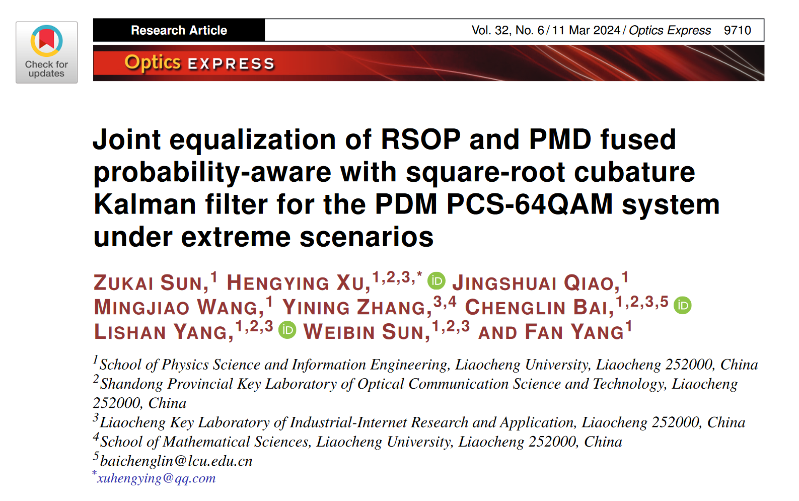 近日,许恒迎教授团队在高阶概率星座整形系统偏振均衡领域取得新进展。该研究成果以“Joint equalization of RSOP and PMD fused probability-aware with square-root cubature Kalman filter for the PDM PCS-64QAM system under extreme scenarios”(“极端情况下用于PDM PCS-64QAM系统的RSOP和PMD融合概率感知和平方根容积卡尔曼滤波器的联合均衡方案”)为题,发表在光学领域权威期刊《Optics Express》(《光学快报》,中科院2区Top期刊,影响因子3.8)。