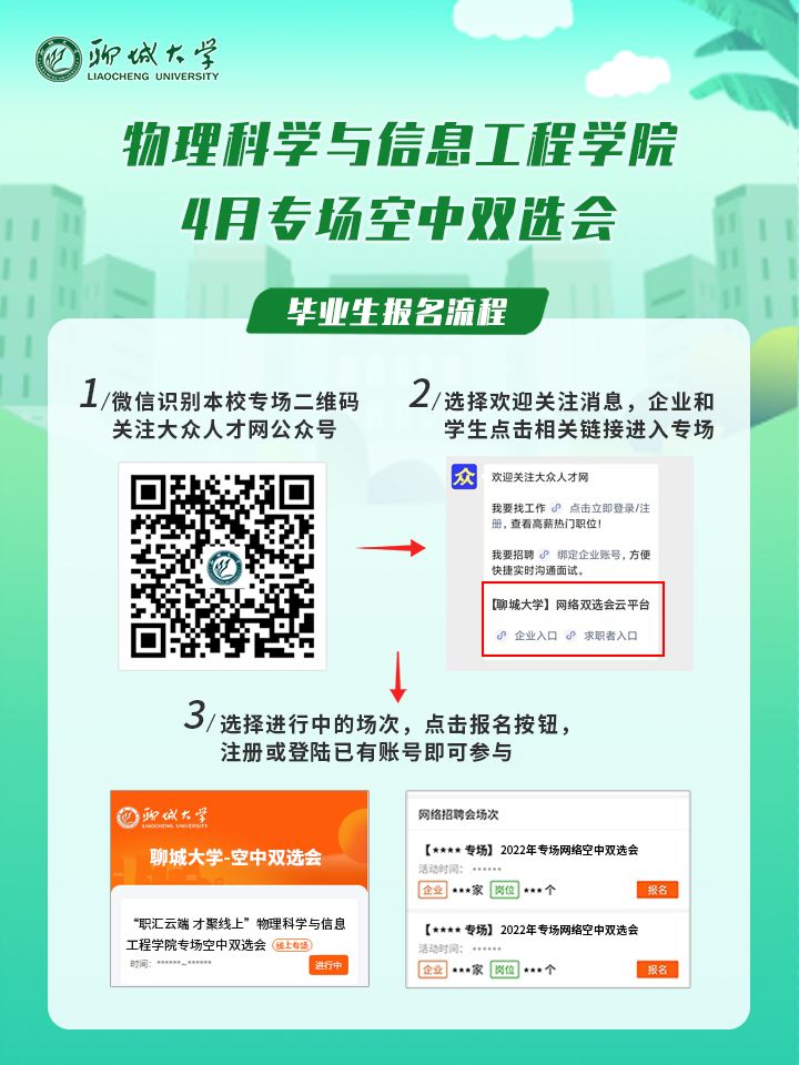 为贯彻落实党中央、国务院“稳就业”“保就业”决策部署,根据山东省人社厅和教育厅对高校毕业生就业工作的相关要求,同时为做好学校疫情防控常态化条件下校园招聘工作,学院联合大众人才网就业平台组织持续性、常态化的就业双选会系列活动,为用人单位招聘和学院应、往届毕业生稳定就业拓路护航,诚挚邀请您参会。