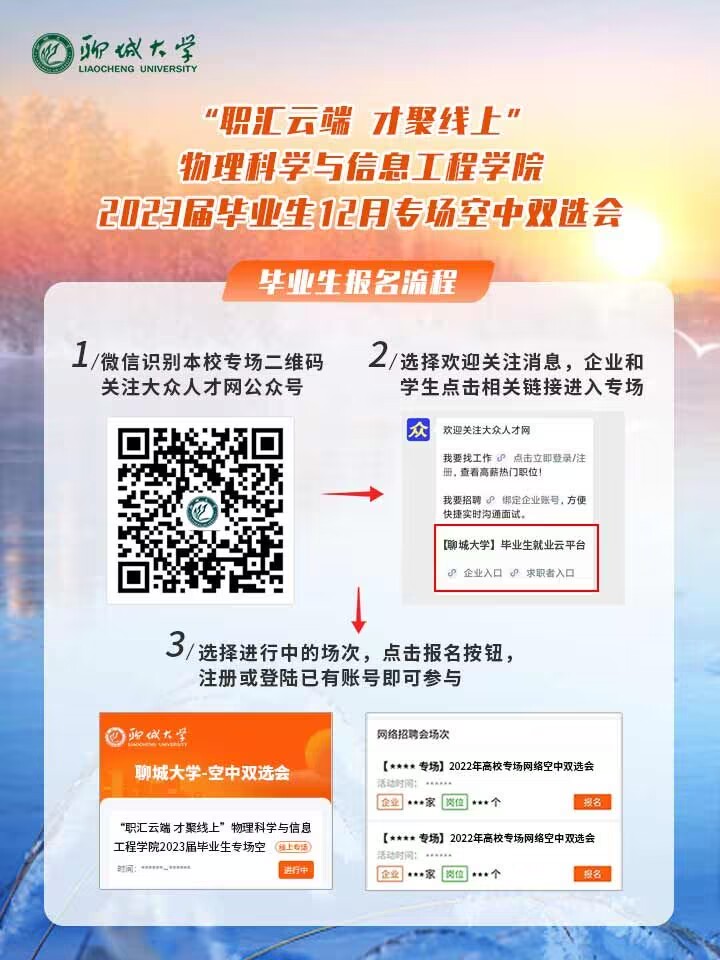 为深入贯彻落实党中央国务院关于高校毕业生就业工作的重要指示精神和“稳就业、保就业”决策部署,积极做好高校毕业生等重点群体就业工作,根据省人社厅和教育厅对高校毕业生就业工作的相关要求,同时为做好学校疫情防控常态化条件下毕业生就业工作,学院联合大众人才网就业平台举办持续性、常态化的空中双选会系列活动,为各企事业单位的招聘和学校应、往届毕业生稳定就业拓路护航,诚挚邀请您参会。
