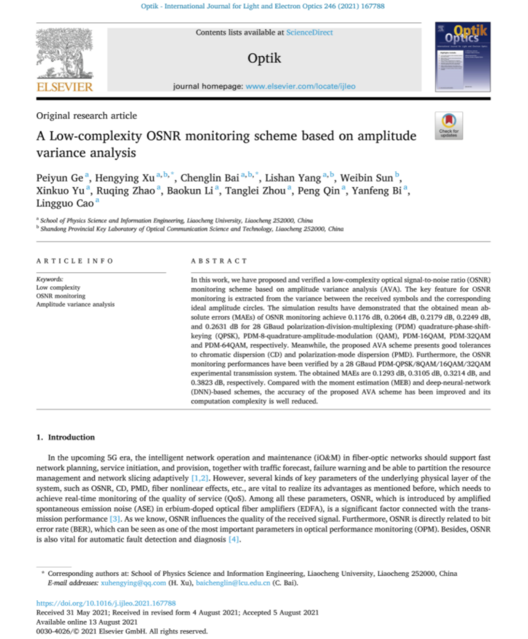 第二、2021年8月份,我院2018级通信工程专业本科生葛佩云同学以第一作者身份在光学领域高质量科技期刊《Optik》(《光学》)发表题为”A Low-complexity OSNR monitoring scheme based on amplitude variance analysis”(“一种基于幅度方差分析的低复杂度光信噪比监测方案”)的研究论文,我校许恒迎教授、白成林教授为通讯作者,英国365集团公司为第一通讯单位。