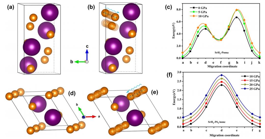 碱土金属氢化物(AeH2, Ae="Ca," Sr, Ba)因其优良的离子导电性和热稳定性而被认为是很有前途的固体储氢材料。然而,AeH2的高分解温度、缓慢的吸附动力学行为和结构的不灵活性阻碍了这些氢化物在储能领域的应用,因为很难通过控制晶格结构来为H-离子创造良好的输运路径。压力可以有效的调控AeH2材料中H-离子的输运性能,从而更好地理解其构效关系。本工作中,刘才龙教授团队与内蒙古民族大学、吉林大学、江苏师范大学合作,通过基于DAC的高压原位交流阻抗谱测量技术,结合第一性原理计算,系统的研究了SrH2在高压下的电输运行为。研究发现,压力诱导的SrH2从Pnma相到P63/mmc相的结构相变伴随着导电行为从纯电子传导到混合离子/电子传导转变的新奇现象。通过等效电路模拟,分别获得了P63/mmc相离子和电子在晶粒和晶界处的传导电阻。相变后,SrH2的总电阻降低了4个数量级,并且出现了低频巨介电行为。团队通过对SrH2中H-离子在传输通道不同位置的势垒能量的计算,阐明了载流子传输类型发生转变的机制。这一研究结果有助于更好地理解碱土金属氢化物高压下的导电机理,并为此类化合物及其他固态储氢材料载流子输运研究及介电性能的优化设计提供了新思路。